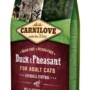 Carnilove Duck/ Pheasant Hairball 2 kg is graanvrij, kwalitatief hoogwaardig volledig voer voor katten met eend en fazant, verrijkt met bietenvezels tegen haarballen. Deze brokken zijn geheel vrij van aardappel en graan, omdat deze ook niet in het natuurlijke dieet van de wilde kat en diens voorouders voorkomt. In plaats daarvan is er gebruik gemaakt van ingrediënten die beter aansluiten bij de voedingsbehoefte van de kat, namelijk een hoog aandeel dierlijke ingrediënten gecombineerd met verse groenten, fruit, kruiden en mineralen. Deze bevatten belangrijke vitaminen en anti-oxidanten, die door de structuur van de gebruikte eiwitten optimaal opgenomen worden door het lichaam. Ook is dit voer verrijkt met bietenvezels die helpen bij het gemakkelijk uitdrijven van haarballen. Het voer is nauwkeurig uitgebalanceerd, makkelijker verteerbaar, holistisch en ook gewoon heel erg lekker.