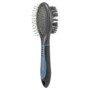 Dubbelzijdige hondenborstel met aan de ene kant metalen pennen met beschermende dopjes voor de verzorging van dekhaar en onderwol en aan de andere kant nylon haren die zorgt voor een mooi en glanzend eindresultaat.