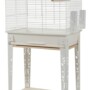 De Zolux Vogelkooi Patio Met Standaard Wit 144 cm is een kooi van metaal en hout voor parkieten, kanaries en andere exoten, in industriële stijl, met schuiflade, zitstokken, schommel en eetbakjes.